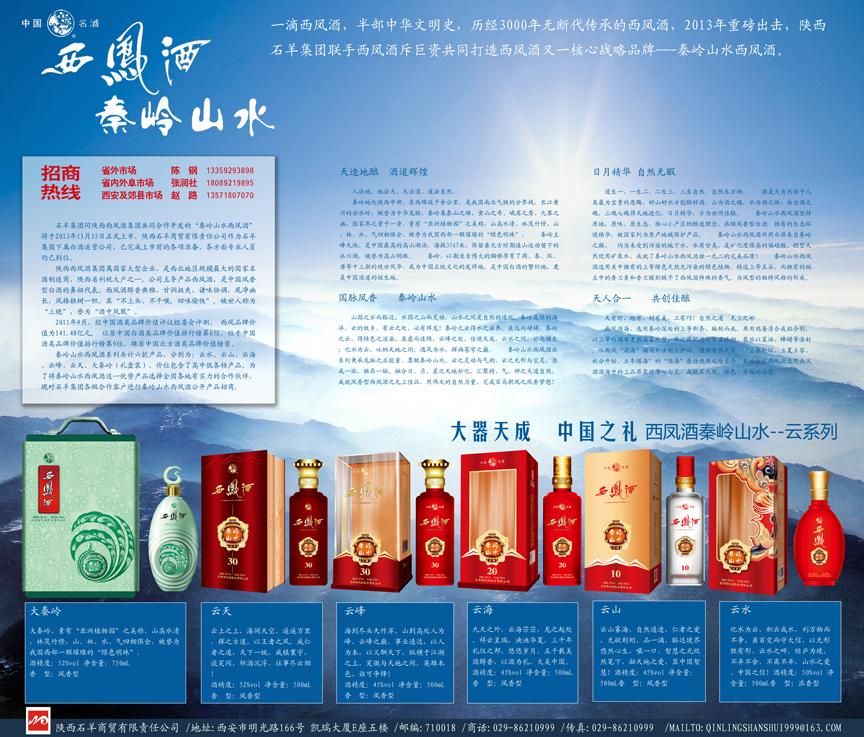 秦嶺山水西鳳酒系列共計六款產(chǎn)品,分別為:云水、云山、云海、云峰、云天、大秦嶺(禮盒裝),價位包含了高中低各檔產(chǎn)品。為了將秦嶺山水西鳳酒這一優(yōu)勢產(chǎn)品選擇全國各地有實力的合作伙伴,現(xiàn)對石羊集團各級合作客戶進行秦嶺山水西鳳酒公開產(chǎn)品招商,各地有合作意向客戶可聯(lián)系石羊商貿(mào)公司以下相關(guān)人員。