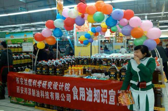 這次推廣,油脂產業以邦淇獲“2013陜西顧客滿意度測評食用油行業最佳顧客滿意獎”殊榮為契機,高度重視、精心組織、全員參與,以“您的健康、我的牽掛”為主題,貫穿“誠信、責任、擔當”;體現“綠色、安全、科普”,為更好指導科學消費,特意邀請石羊油脂產業戰略合作伙伴——西安油脂科學研究設計院有關專家全程參與西安的全部活動,接受消費者現場咨詢、舉辦油品知識講座、指導食用油鑒別常識,重點是結合石羊油品安全、綠色、健康的價值理念進行宣講,西安KA分別在華潤渭濱路店、人人樂玉祥門店舉行,兩天達成銷量180桶;社區分別在大明宮西鐵小區、鳳城六路菁華名門、乾唐華府舉行,兩天實現銷售100余桶,通過空桶優惠、贈送防霧霾口罩等形式,對邦淇特別是石羊品牌的傳播意義深遠。