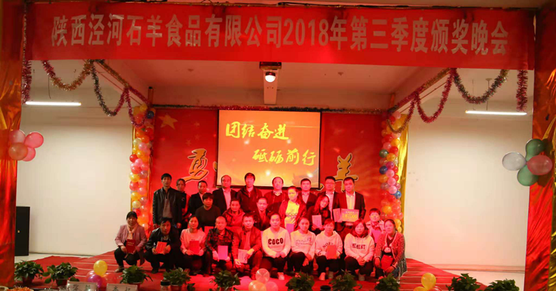 2018年10月14日,陜西涇河石羊食品有限公司在公司宴會廳隆重舉行“2018年第三季度文藝晚會暨表彰大會”。當天,涇河食品公司所有家人歡聚一堂,熱情似火,一起總結(jié)2018年第三季度的成就與不足,同時展望第四季度的方向和目標。大會同時表彰了2018年第三季度為公司發(fā)展作出突出貢獻的優(yōu)秀員工、質(zhì)量標兵、技術(shù)標兵、創(chuàng)新能手和優(yōu)秀管理團隊。