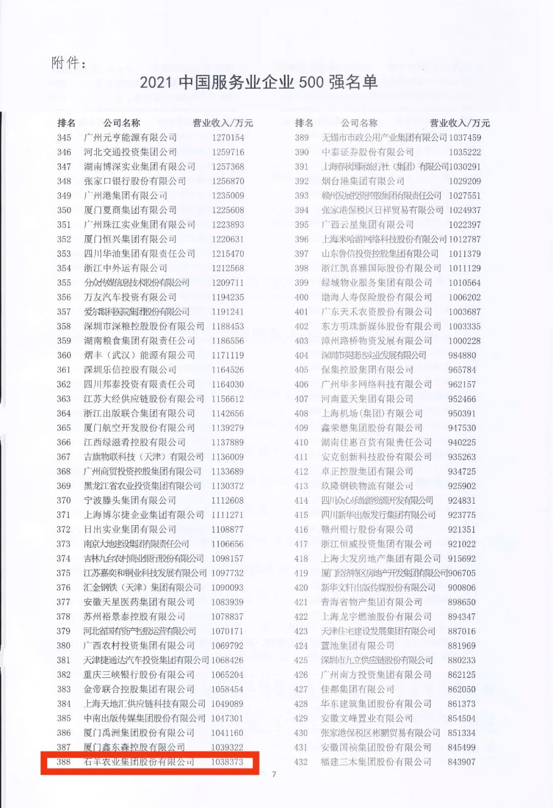 9月25日,在吉林長(zhǎng)春舉行的2021中國(guó)500強(qiáng)企業(yè)高峰論壇上,石羊集團(tuán)憑借上年度優(yōu)異表現(xiàn)首次入圍中國(guó)服務(wù)業(yè)企業(yè)500強(qiáng),名列榜單第388位。