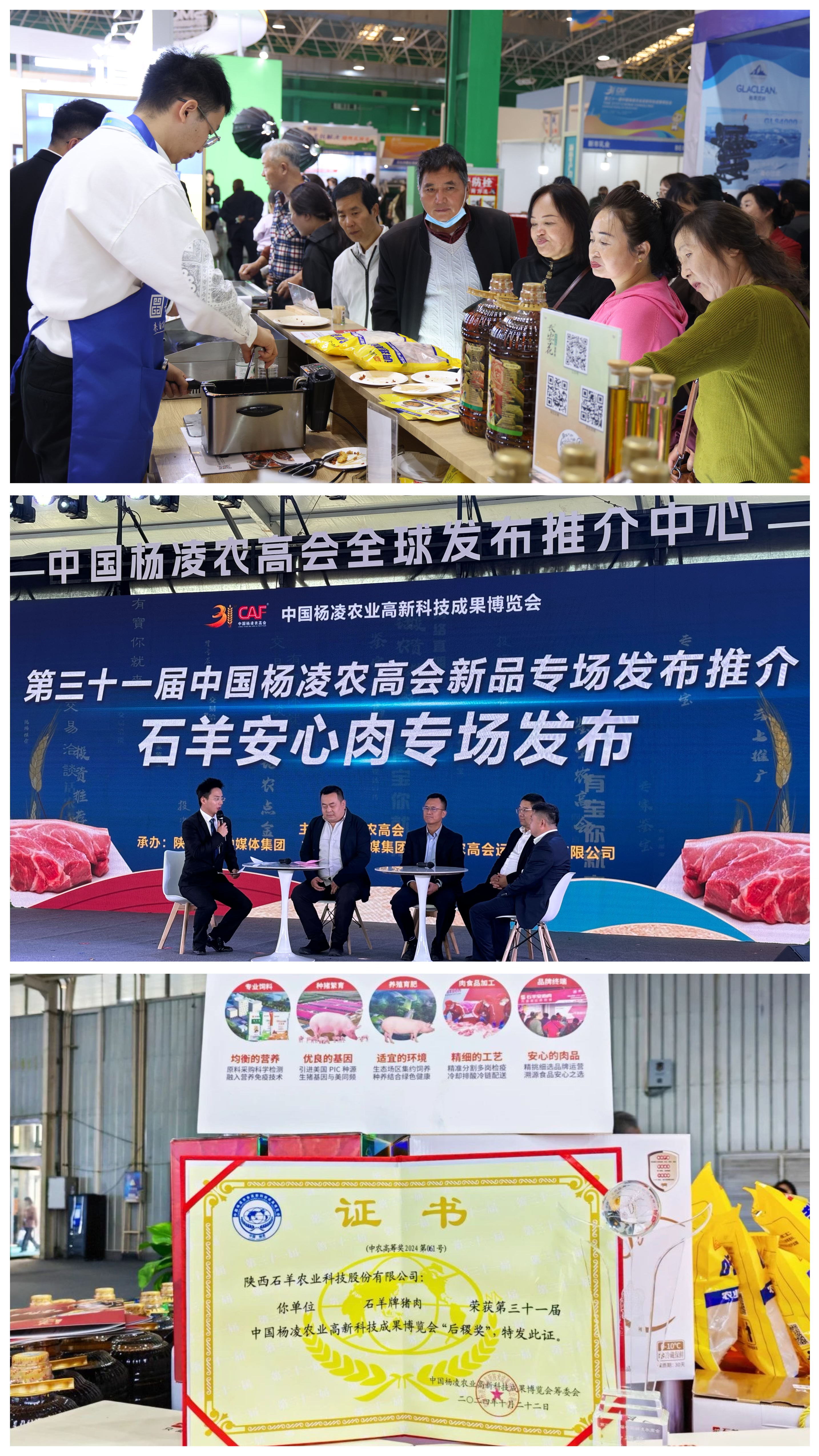 石羊集團始終圍繞“一桶油、一塊肉、一道菜”的全產業鏈發展模式進行展示展出。除開幕式外,還受邀參加農業銀行鄉村振興重點產品推介會、農高會新品專場發布推介會等會議論壇,積極參與各項評比和電商直播,活動精彩紛呈。在本屆農高會上,石羊集團榮獲第三十一屆中國楊凌農高會“優秀展示獎”、石羊安心肉榮獲第三十一屆中國楊凌農高會“后稷獎”、農業科技報社“第三十一屆中國楊凌農高會-優秀新品獎”等榮譽。